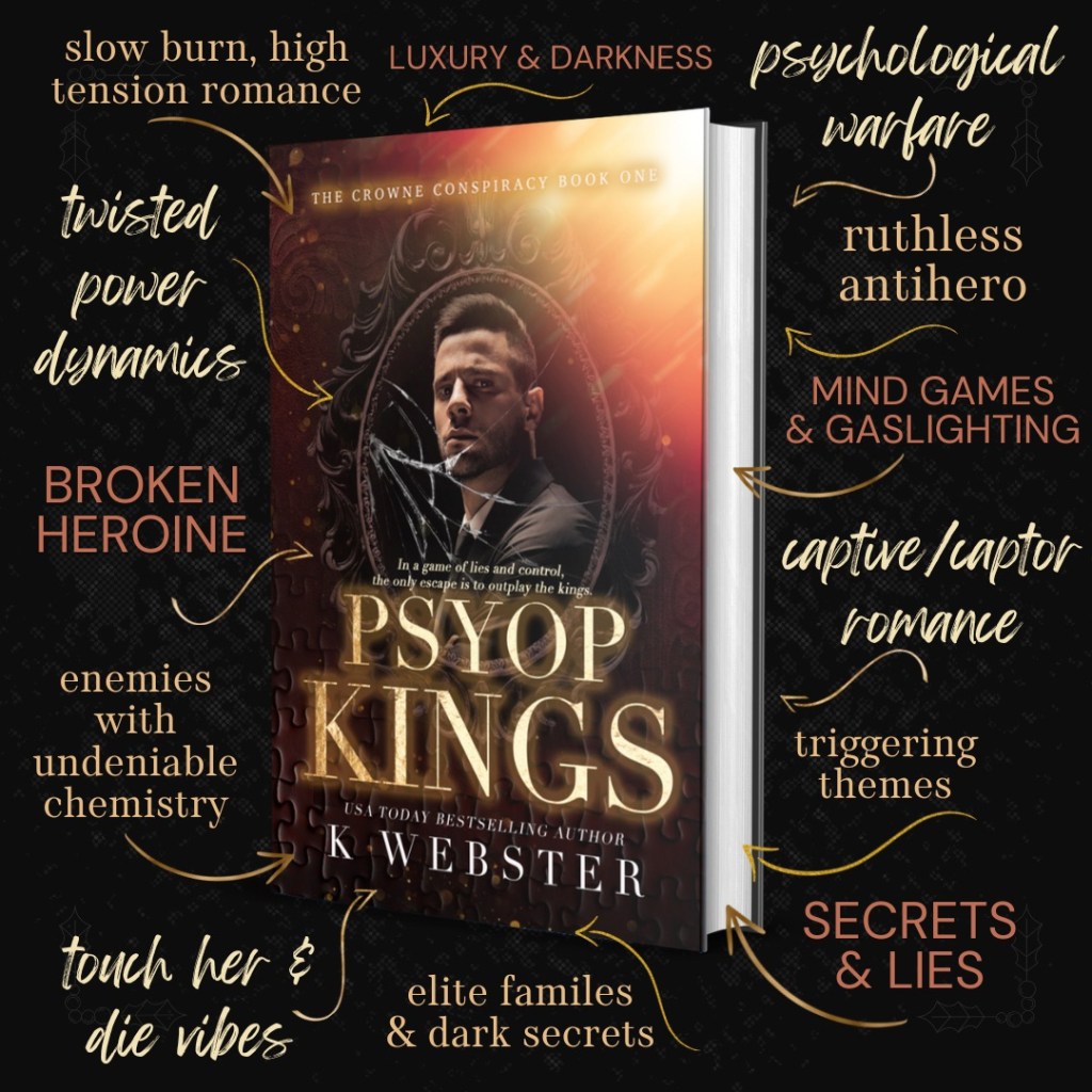 Psyop Kings is book one in The Crowne Conspiracy trilogy. This book is a dark, psychological romance that contains triggering content. This book ends on a cliffhanger.