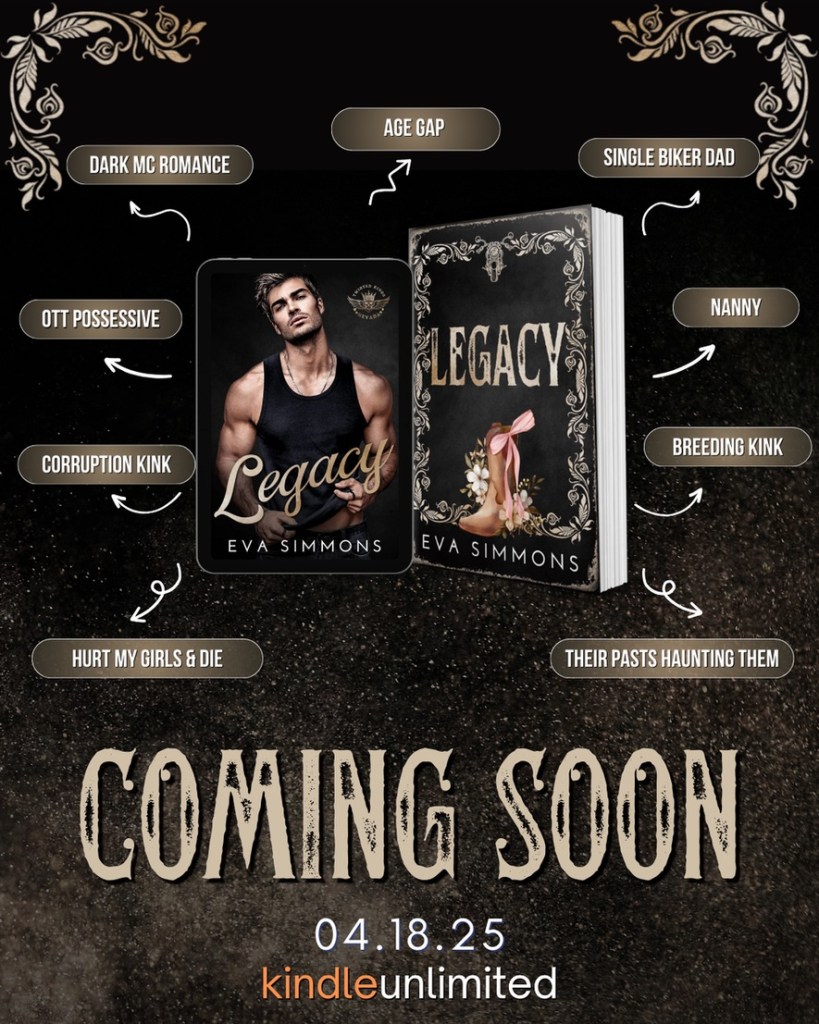 Author’s Note: Legacy is a dark MC romance between a single biker dad and his daughter’s new nanny. It has a morally grey hero, heavy subject matter, mature content, and explicit scenes. Content/TWs (which contain spoilers) can be found on author’s website. 18+ Standalone with HEA guaranteed.