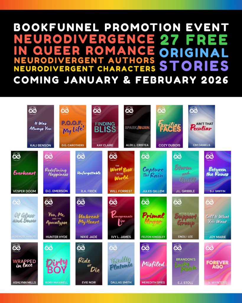 The Neurodivergence in Queer Romance BookFunnel Promotion aims to increase accurate, authentic, compassionate, and respectful representation of the vast and varied neurodivergent experience. Each story is by a queer neurodivergent author and features various neurodiverse and queer representation.