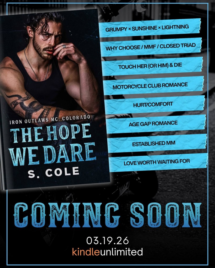 From USA Today best selling author Scarlett Cole, writing as S. Cole, comes an electrifying MMF, grumpy x sunshine x lightning, motorcycle club romance.